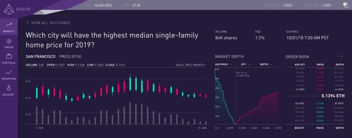 - Platforma Augur umożliwia użytkownikom tworzenie zdecentralizowanych rynków prognoz.